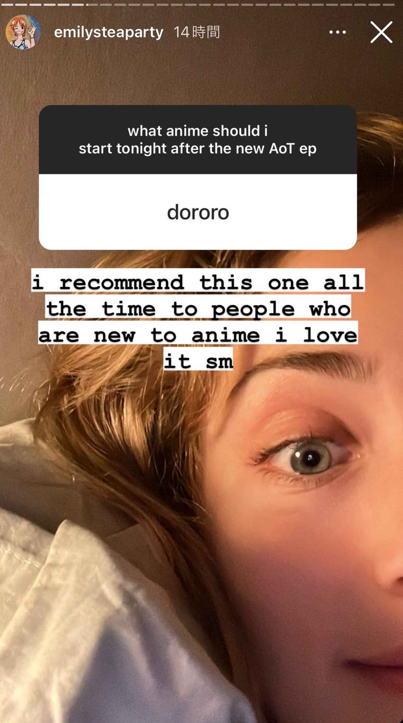 エミリーの“鑑賞済み報告”はその後も止まらず、『どろろ』をおすすめされた際には、「私もいつも、新しくアニメを観始める人たちみんなにこの作品をおすすめしてる。大好き」として、自分のおすすめアニメであることを明かした。