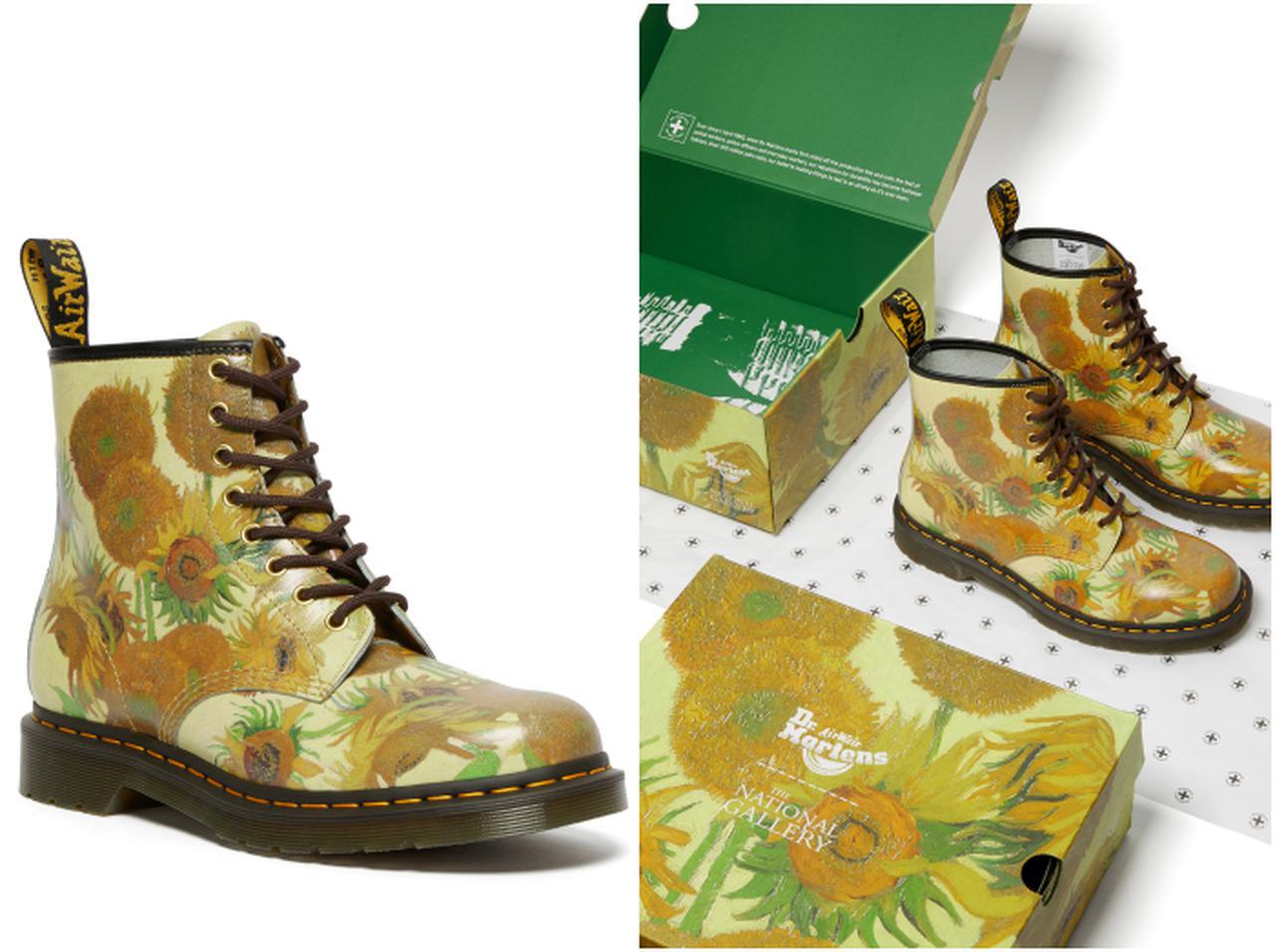 ゴッホの名作「ひまわり」が全面に鮮やかにプリントされたベースには、ドクターマーチンの記念すべきファーストモデルでブランドを代表する「1460 8ホールブーツ」を採用。ダークブラウンのシューレースがセットされ、仕上げにはドクターマーチンのシグネチャーであるヒールループと、イエローウェルトステッチで完成されている。