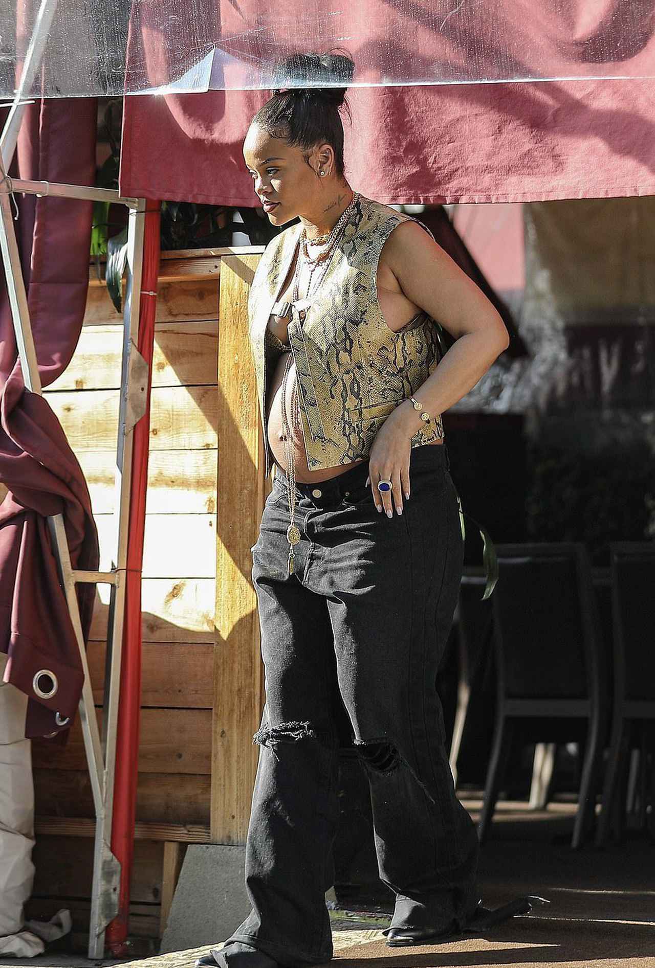 そんなリアーナが、セレブ御用達の日本食レストランNobuでランチを訪れるところが目撃された。この日もフロント部分が大きく開いたパイソン柄のベストにウォッシュ加工が施されたジャケット、そして黒のワイドデニムと、かなりエッジが効いたスタイル。