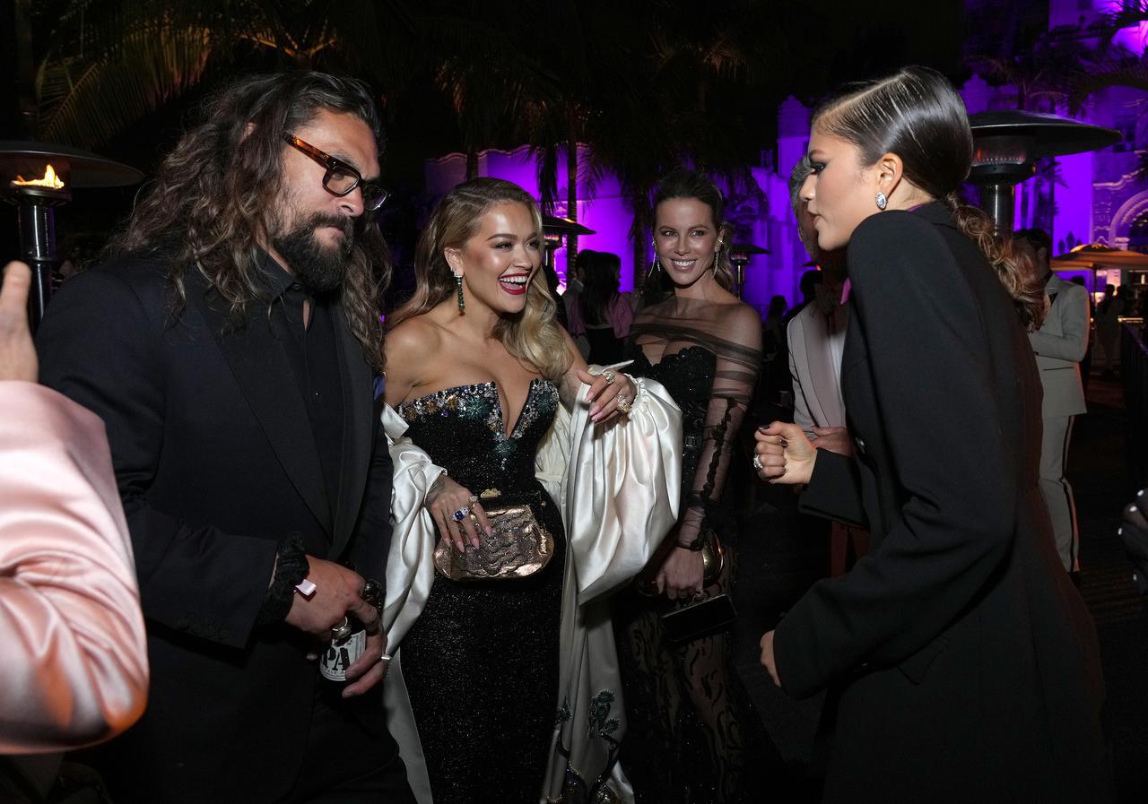 米Vanity Fair主催のアフターパーティーでリタ・オラやゼンデイヤたちと談笑するジェイソン・モモア(左)とケイト・ベッキンセイル(中央右)。