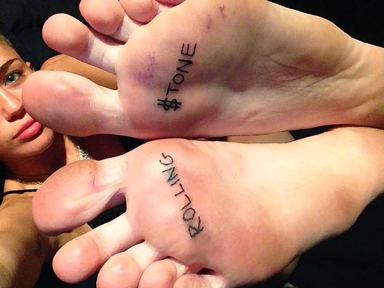 シンガーのマイリー・サイラスは、米Rolling Stoneの初めての表紙を記念して、2013年に右足の裏に「ROLLING」、左足の裏に「$TONE」という文字のタトゥーをオン。すでにいくつかのタトゥーを入れているけれど、足の裏まで入れているのは流石。