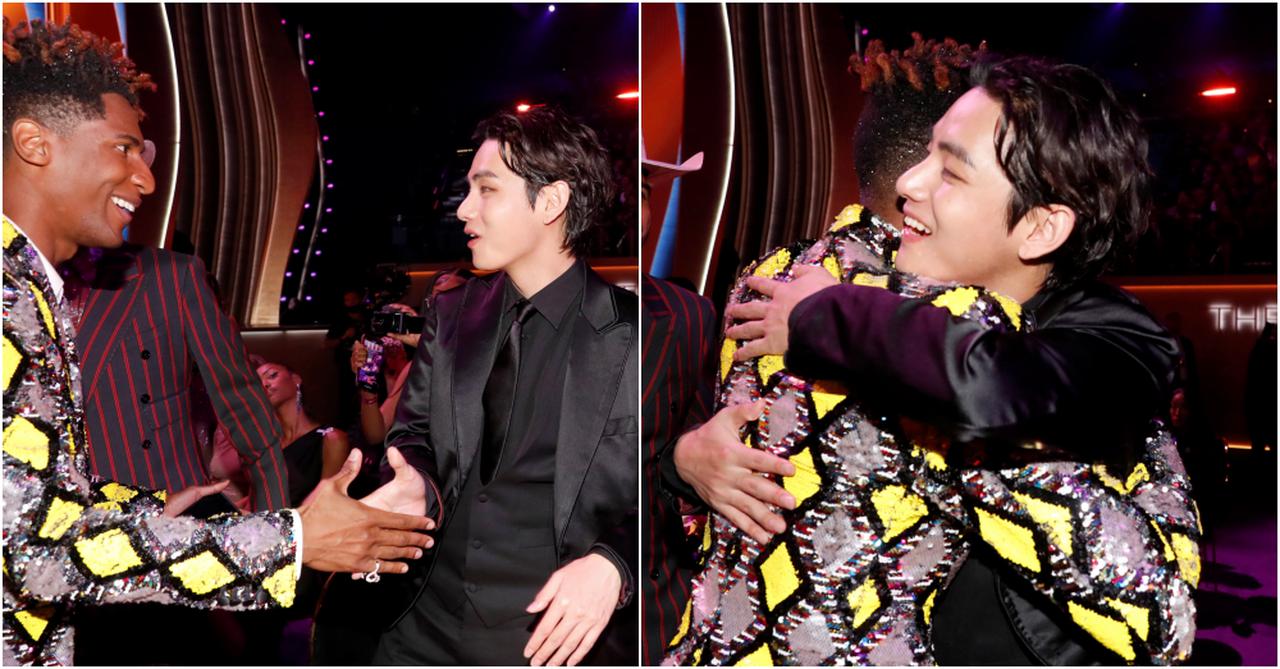 今年の最多ノミネートであるジョン・バティステとBTSのVはハグで対面を喜んだ。