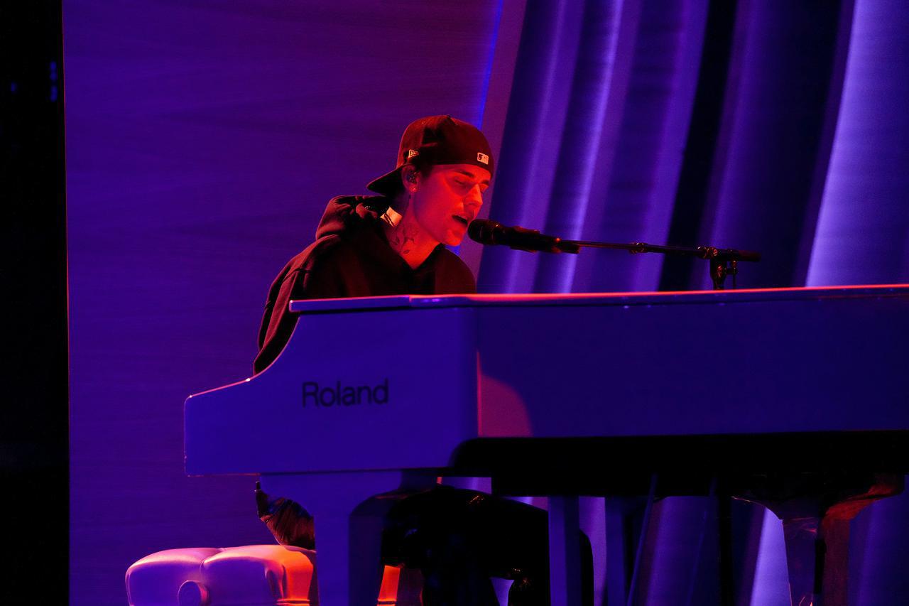 シンガーのジャスティン・ビーバーがグラミー賞授賞式のステージでパフォーマンスを披露する様子を、うっとりとした表情で見つめる妻でモデルのヘイリー・ビーバーの姿が微笑ましい。(フロントロウ編集部)