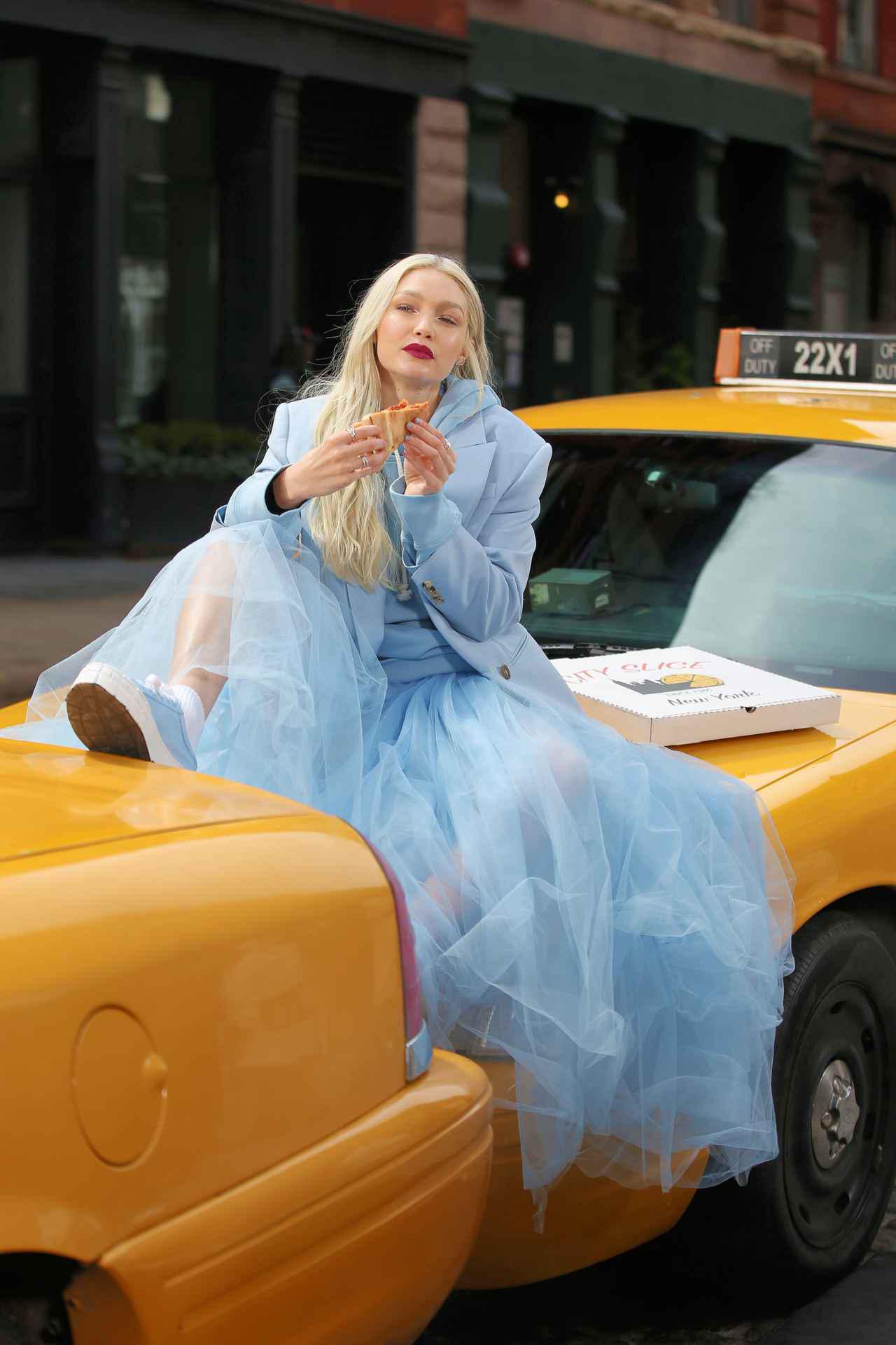 この日は基本的にタクシーの上で撮影。タクシーの上に立ったり、寝転がったり、さらにはピザを食べたりと様々なポージングで撮影を進めた。