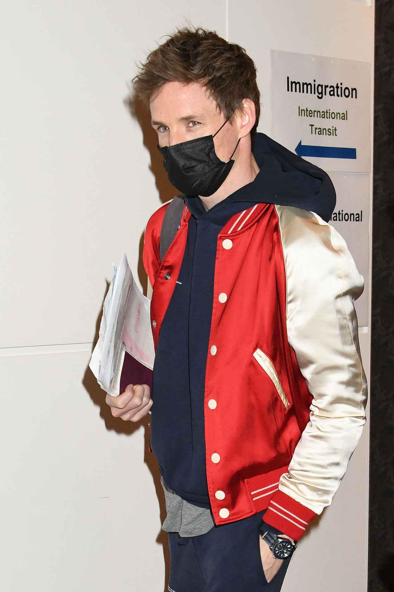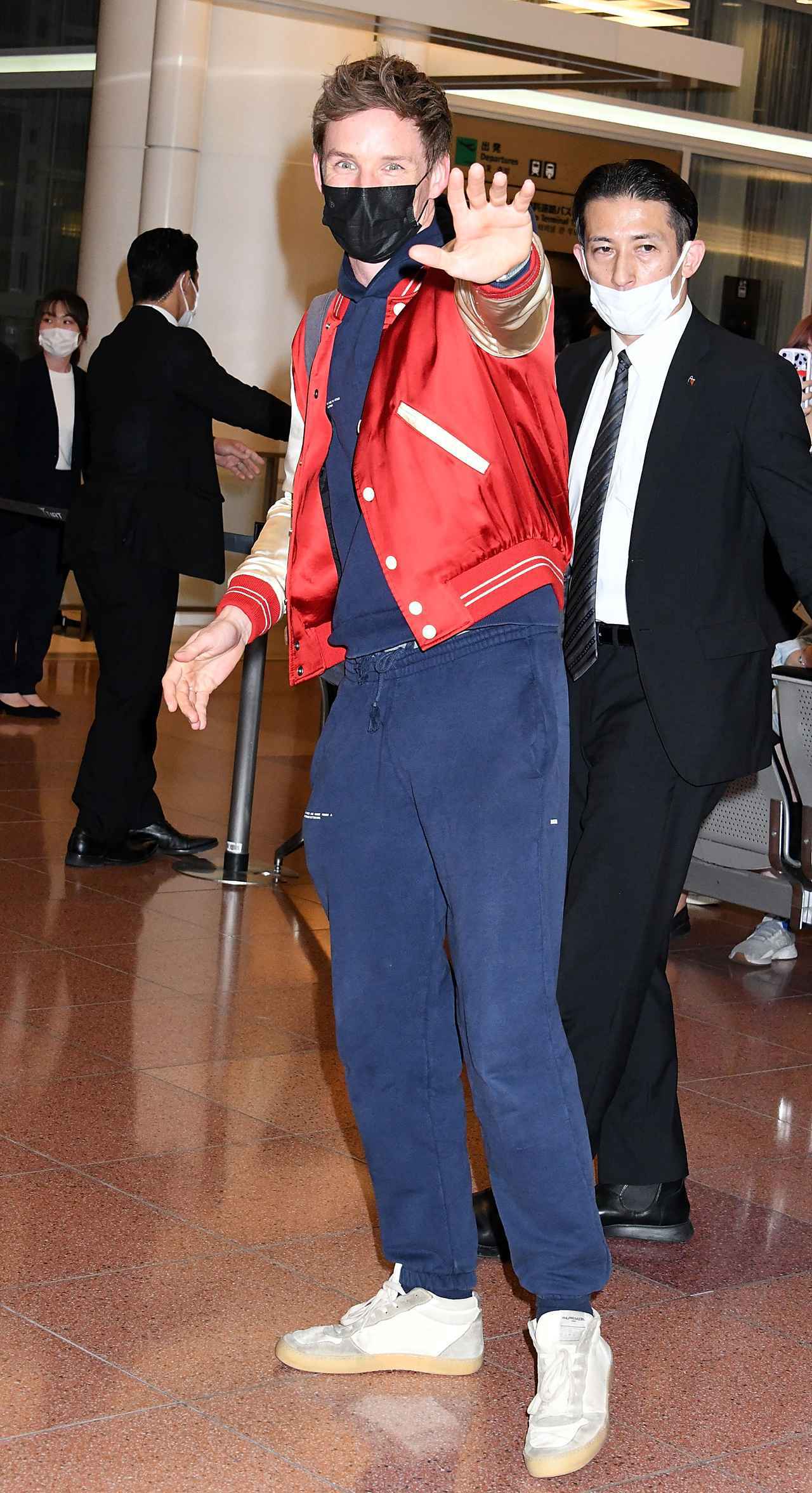 エディは、スウェットのセットアップにボンバージャケットというロングフライトにぴったりな、カジュアルなスタイルで日本に降り立った。まだ新型コロナウイルスが収束していないこともあり、空港で待っていたファンにサインを書いたり写真を撮ったりという、直接的な交流をすることはなかったものの、待ってくれていたファンに感謝した。