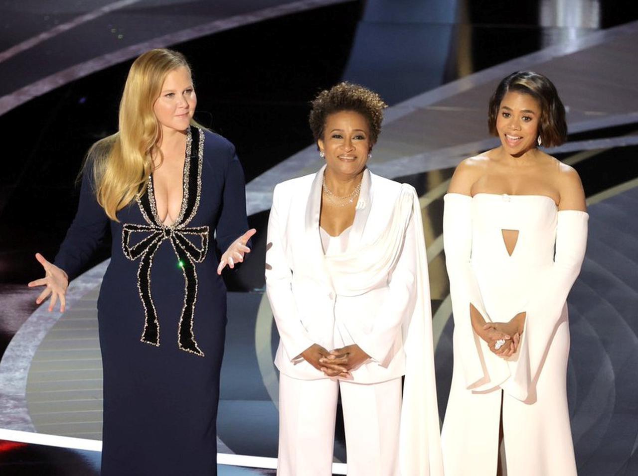 現地時間2022年3月27日に米ロサンゼルスのドルビーシアターで開催された第94回アカデミー賞授賞式で、ワンダ・サイクス、レジーナ・ホールとともに司会を務めたコメディ俳優のエイミー・シューマー。