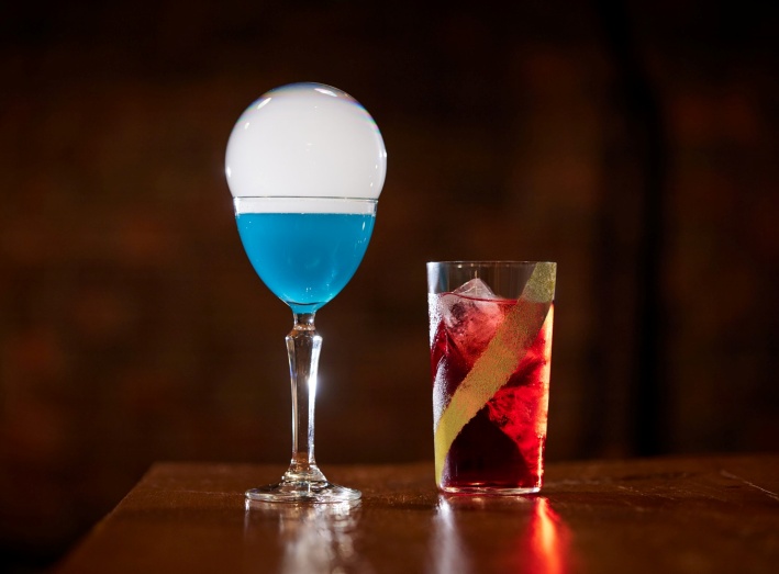 そして劇中でおなじみの赤と青のピルをイメージした2種類のオリジナルカクテルが登場。青いカクテル「V」は、ハーブリキュールべをベースにグレープフルーツを合わせたリフレッシングドリンク。もう1つの赤のカクテル「R」は、ミルクウォッシュしたウィスキーをベースに、様々なフルーツを加えたスッキリとして大人のミックスジュースに。