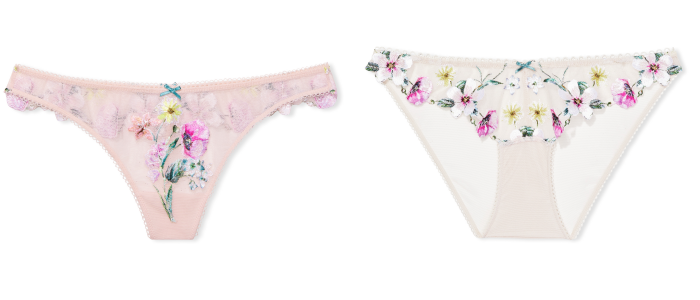 ヒップを適度にカバーするフェミニンさ満開のショーツ。フローラルの刺繍、シアーなメッシュ、小さなリボンなどディテールまでこだわった作りに。