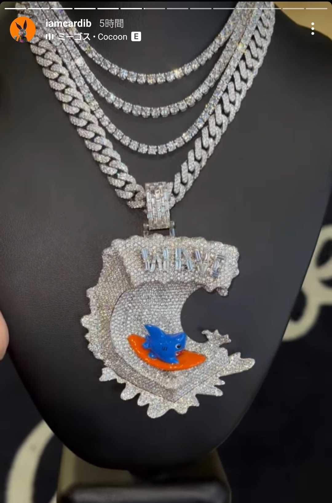 ウェーブがつけているネックレスは、カスタムジュエリー・メーカーのエリアンテ(Eliantte)のもので、カルチャーもここのブランドのネックレスをよく身につけている。カルチャーにプレゼントしたエリアンテのネックレスが、1,000万円超えのものばかりだったので、ウェーブのものも同等の値段のものの可能性が高い。