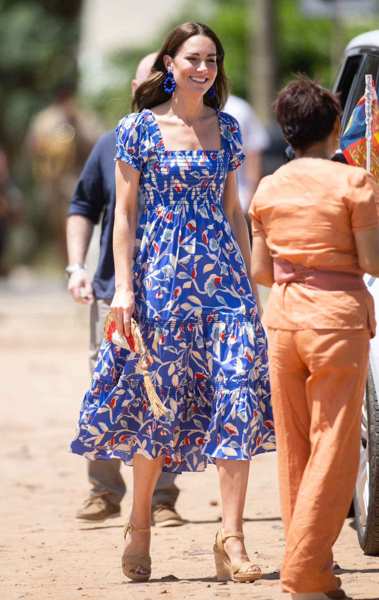 バカンスにぴったりなTory Burchのワンピースは、青のピアスとリンクさせて。キャサリン妃がお気に入りのウエッジヒールを合わせたスタイルは、バカンス先でのドレスアップのお手本のよう。