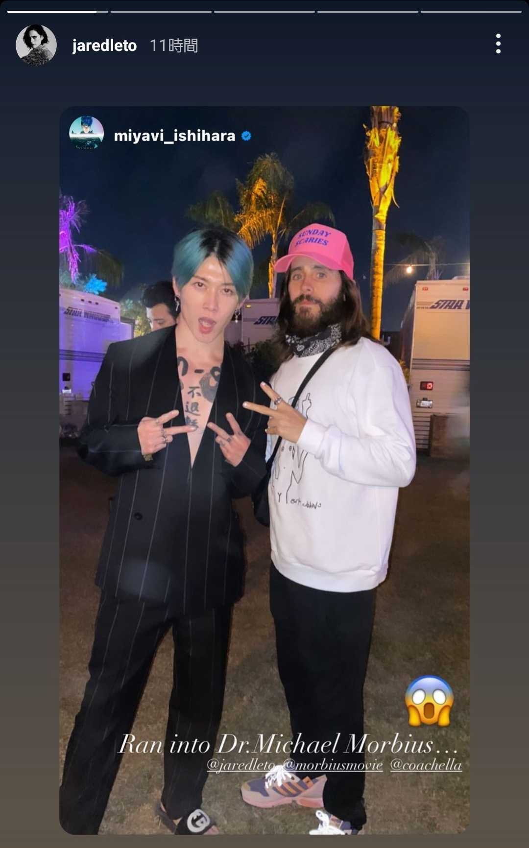 その俳優とは、現在上映中のMCU映画『モービウス』で主人公のマイケル・モービウスを演じたジャレッド・レト。ジャレッドは観客としてコーチェラを訪れていたよう。MIYAVIはジャレッドと交流したようで、SNSに写真をあげると、「マイケル・モービウス博士とばったり遭遇」とコメントし、叫んでいるような絵文字をつけた。