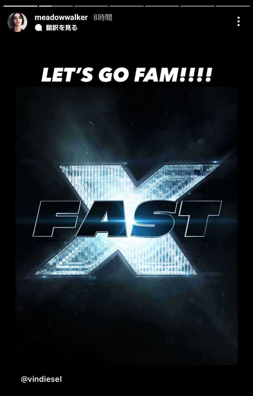『ファストX』の撮影開始の情報には、なんと『ワイスピ』シリーズの1作目からメインキャストとして出演し、2013年に不慮の交通事故で40歳という若さで他界したポール・ウォーカーの子供であるメドウ・ウォーカーも反応。メドウはヴィンの投稿を引用する形で、「ファミリーたち頑張って」と自身のインスタグラムでキャストたちを鼓舞した。