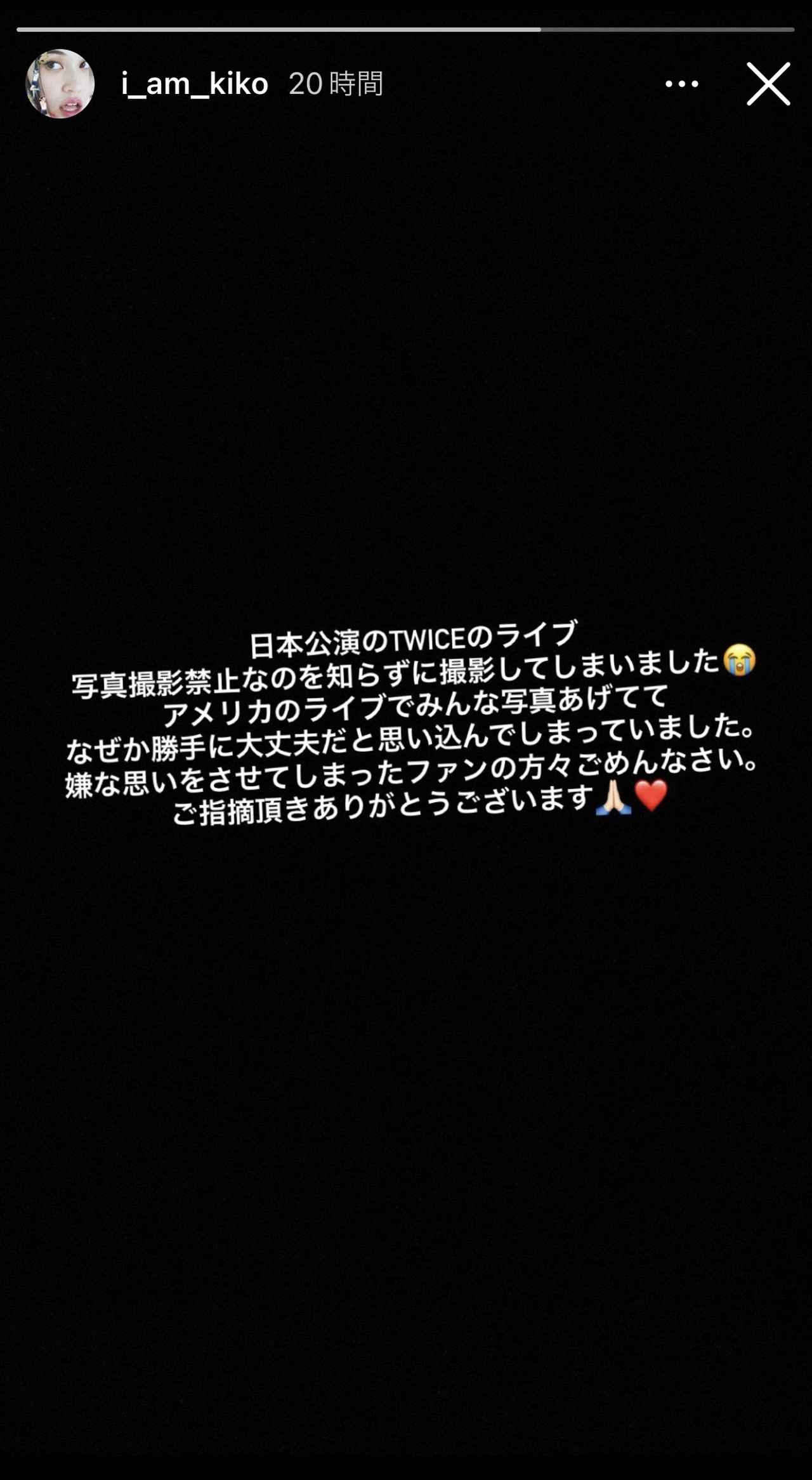 その後、水原希子はインスタグラムストーリーズを更新して、謝罪のコメントを投稿。「日本公演のTWICEのライブ、写真撮影禁止なのを知らずに撮影してしまいました。アメリカのライブではみんな写真あげてて、なぜか勝手に大丈夫だと思い込んでしまいました。嫌な思いをさせてしまったファンの方々ごめんなさい。ご指摘いただきありがとうございました」と綴って、写真を撮影してしまった理由についても説明した。