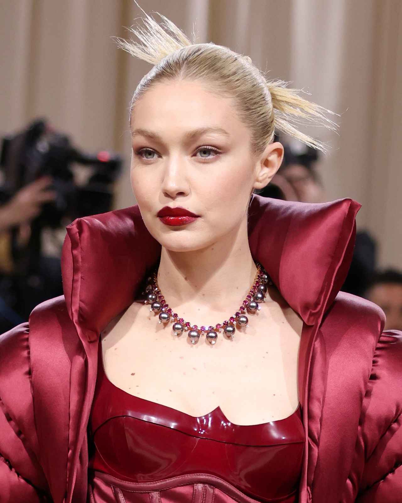 モデルのジジ・ハディッドは、深紅のエレガントな衣装にあわせて、深みのある赤リップを主役にしたメイクで登場。あえてほかのパーツのメイクは控えめにすることで、バランスの良い仕上がりに。また、ホワイトに近いプラチナブロンドがさらに透明感を引き立てている。