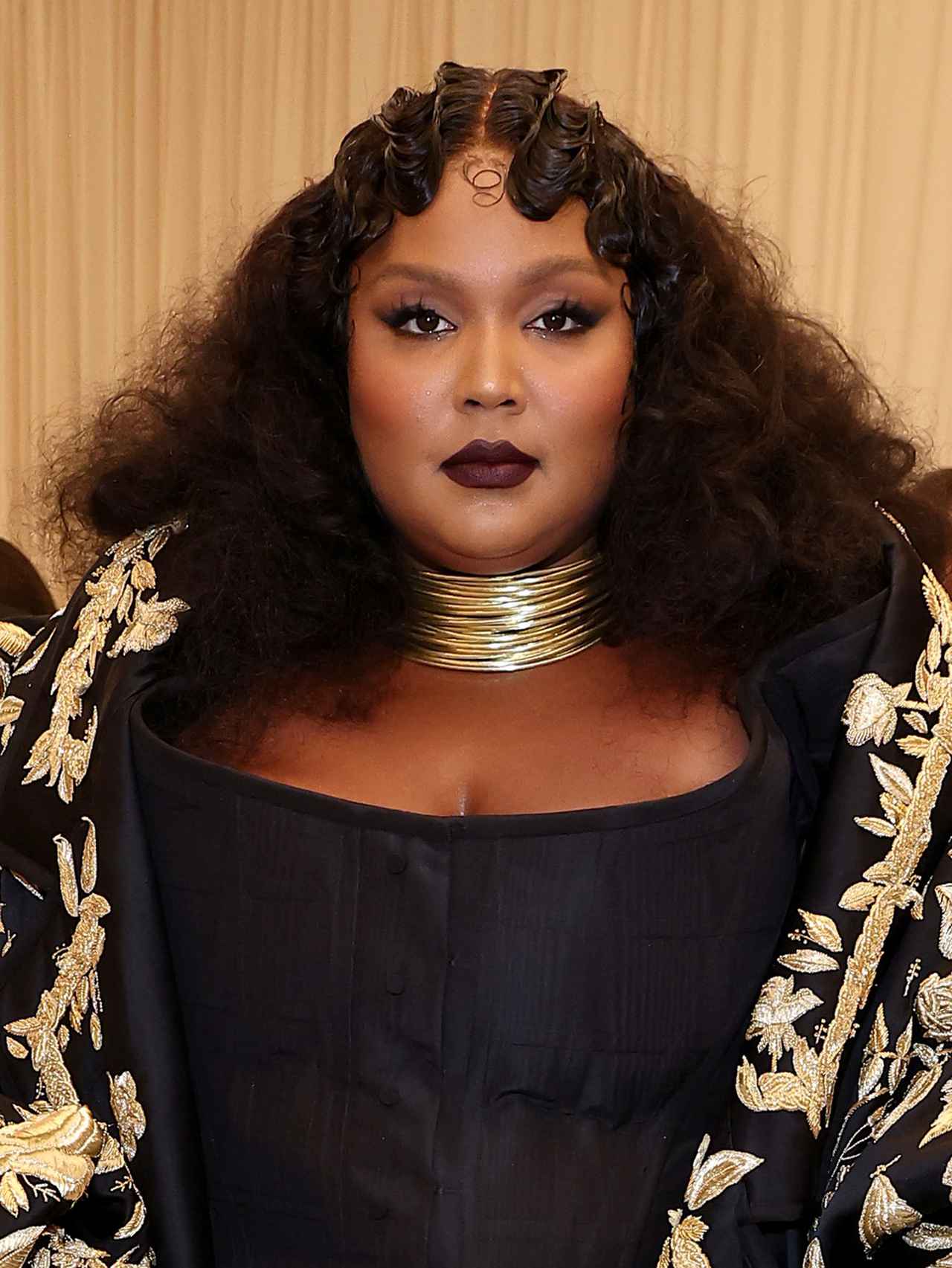 シンガーのリゾは、1920年代のフラッパールックを彷彿とさせるフィンガーウェーブヘアに合わせて、メイクも当時流行したスモーキーなブラックアイシャドウに、ベリートーンの深みあるダークリップでとことんレトロに。