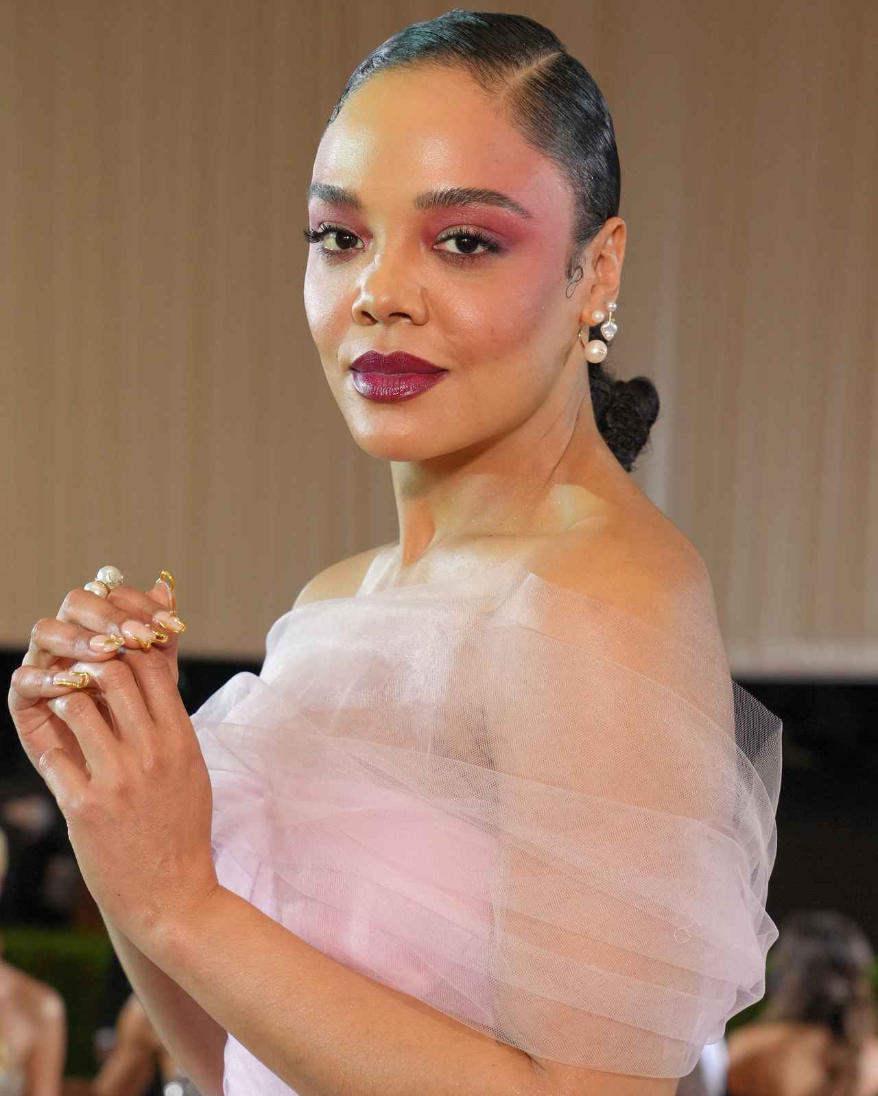 俳優のテッサ・トンプソンは、綿菓子のようなふわふわとしたピンクドレスに合わせてメイクもピンクで統一感。カラーは、深みのあるパープルピンクにすることで、上品な大人っぽさをプラス。