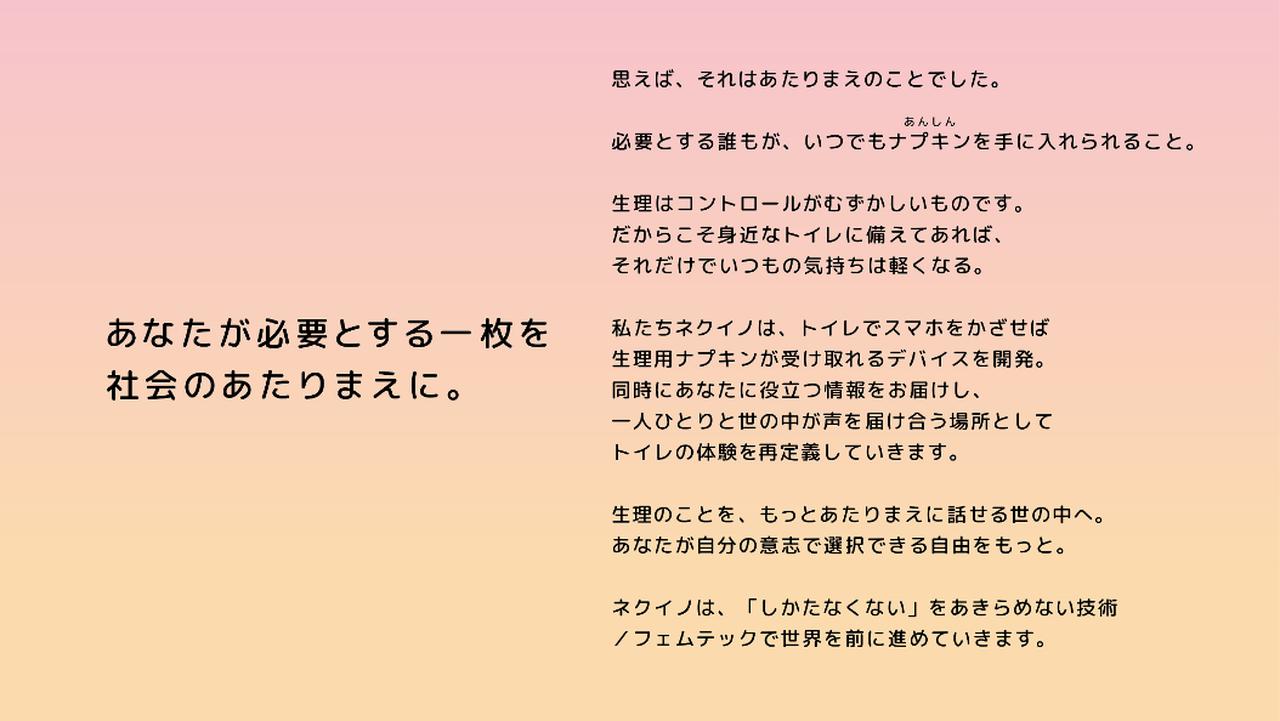 そんななかより大きな社会の変革として、公共の場にいつ生理になっても安心できる環境を提供したいと考え、トイレットペーパーがトイレに常備されているように、生理用ナプキンがトイレで受け取れる新しい当たり前をつくるべく、「この一枚をあたりまえに」を合言葉に「トレルナプロジェクト」を発足した。