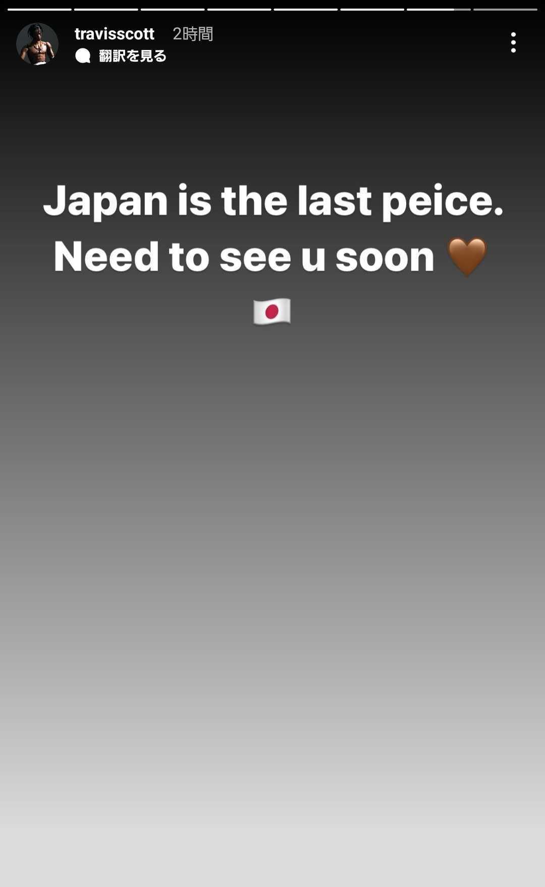 そんなトラヴィスが、インスタグラムのストーリーズで「日本は最後のピースなんです。すぐに会いましょう」と、日本が現在計画しているプロジェクトの「最後のピース」なのだと意味深コメントをした。