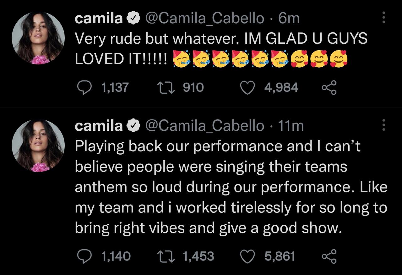 チャンピオンズリーグの決勝戦となると、ファンのボルテージがかなり高く、試合前から大盛り上がり。そのためカミラはパフォーマンス後「私たちのパフォーマンスを見返すと、パフォーマンス中に人々がチームのアンセムを大声で歌っていたなんて信じられないです。私のチームと私は、雰囲気を盛り上げ、良いショーを提供するために長い間、疲れをよそに働いてきました」と怒りのツイート。そしてその後、カミラは落ち着きを取り戻したのか「とても失礼ですが、もういいです。みんなが気に入ってくれてよかったです」とツイートした。