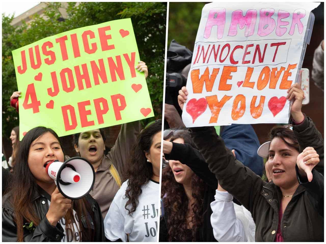 裁判所の前でジョニー・デップを応援するファン(左)とアンバー・ハードを応援するファン(右)。