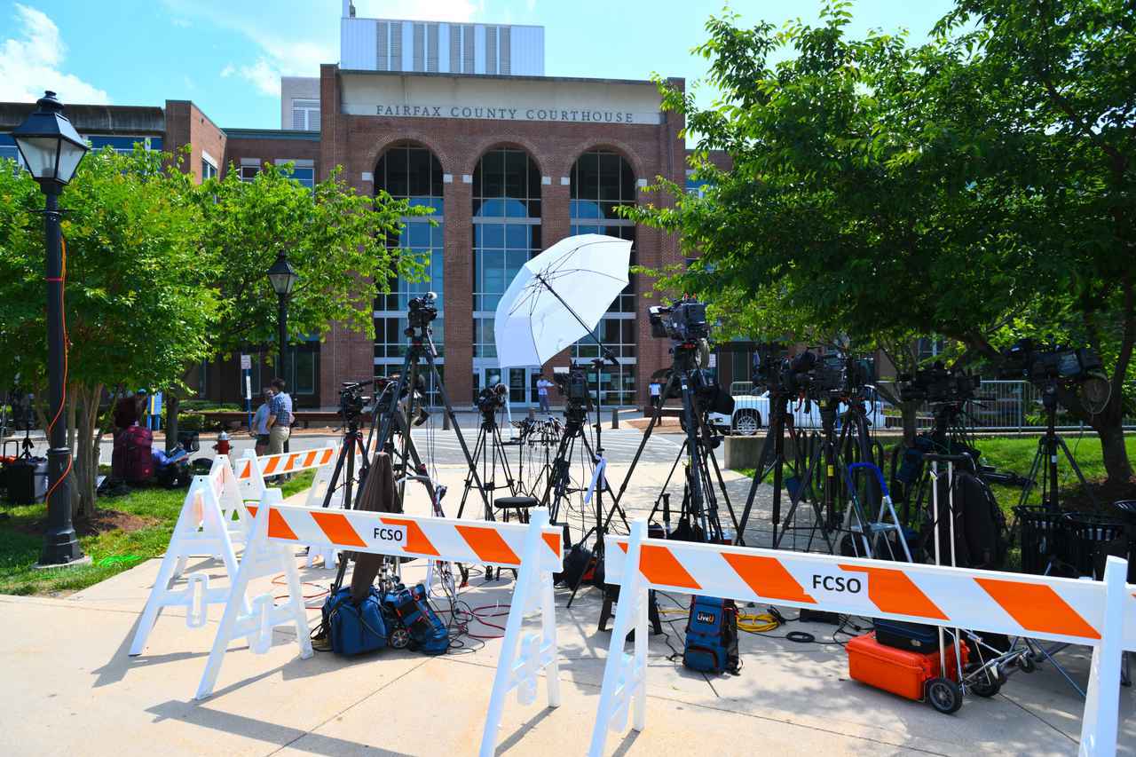 現地時間5月31日、裁判所の前に設置された報道陣のカメラ。
