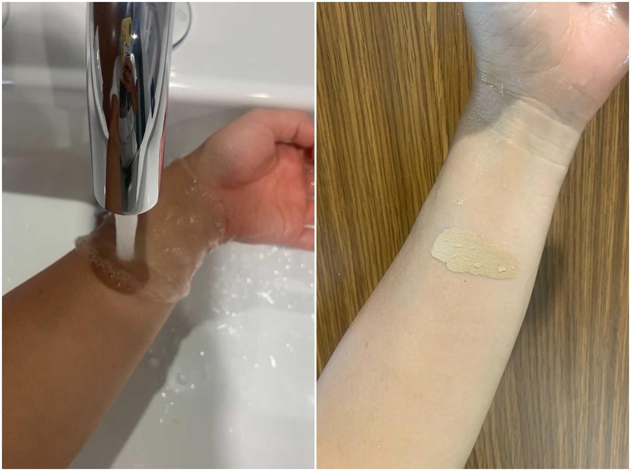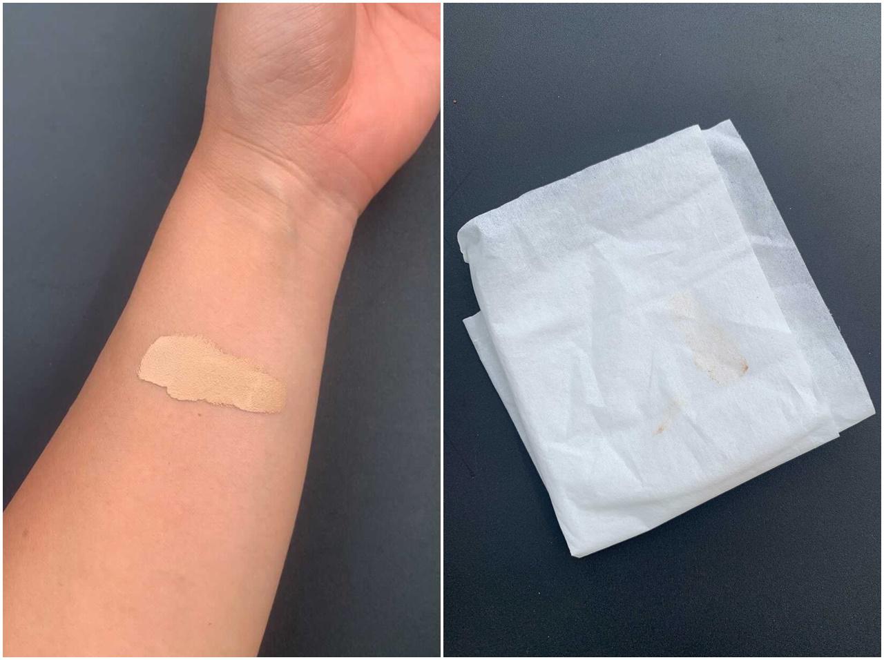 そんな大満足の崩れにくさを伝えるため、簡単なテストも実行。腕にベースメイクコスメを塗り、少し時間を置いてから「レブロン カラーステイ ロック セッティング ミスト」をオン。ティッシュでこすってみても、ほんの少し付着した程度だった。