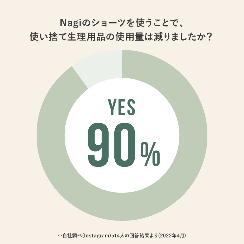 Nagiの調査では、90%※のユーザーが「Nagiのショーツを使うことで、使い捨て生理用品の使用量が減った」と回答。くり返し使える選択肢を取り入れることで、少しでもプラスチックゴミを削減することが可能に。くり返し使えるNagiのショーツは、環境を考えるエコな選択肢のひとつとしても好評を得ている。