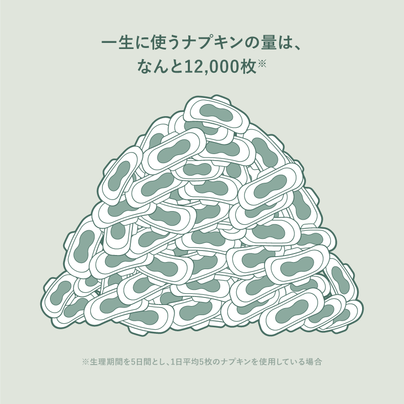 生涯で1万2,000枚も消費すると言われているナプキンは、1枚につきレジ袋1/3枚分のプラスチックでできているため、定期的に消費する生理用品が温暖化の原因になってしまう。