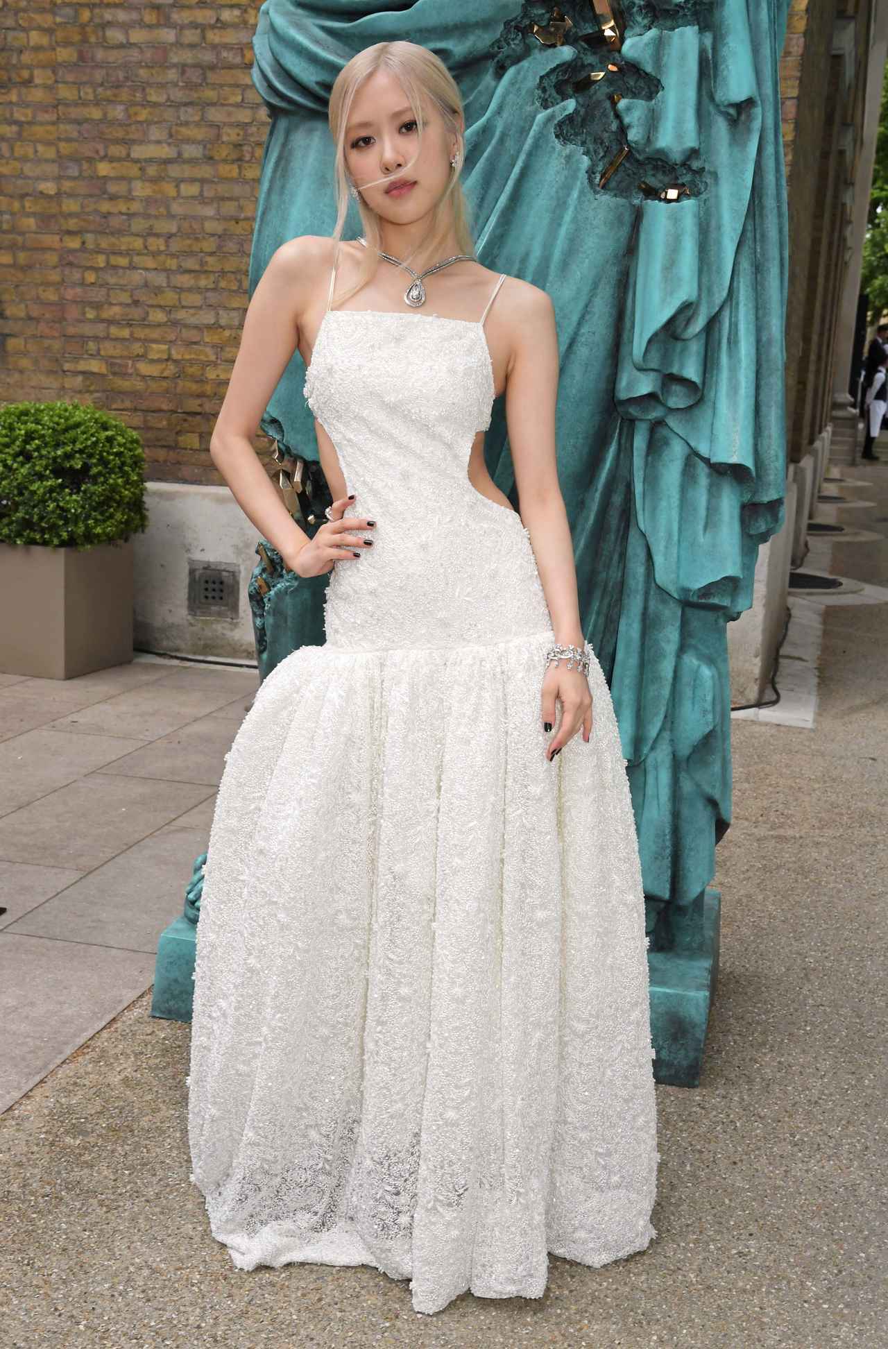 ロゼはサイドに大胆なカットアウトが入ったRokhの真っ白なドレスを着用してパーティーに参加。