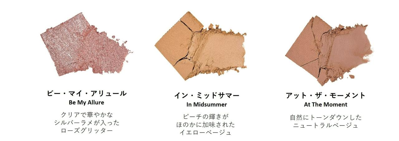 カラーはイエローベージュ「イン・ミッドサマー」、ニュートラルベージュ「アット・ザ・モーメント」、ローズグリッター「ビー・マイ・アリュール」の3色。夏らしいオレンジカラーをベースに、ややトーンダウンしたカラーが、繊細で大人っぽい雰囲気を演出してくれる。