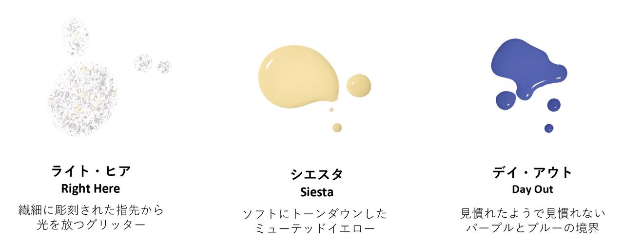 光を放つグリッター「ライト・ヒア」、ミューテッドイエロー「シエスタ」、パープルとブルーの境界カラー「デイ・アウト」の3色展開で、どれもさわやかで夏っぽい。季節の新しい風を取り入れながら躍動する夏の活気を感じられるシーズナブルカラーで、夏のセルフがぐんとオシャレになるはず。