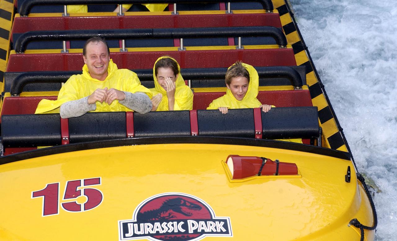 2002年にユニバーサル・スタジオ・ハリウッドでアトラクションを楽しんだエマ(中央)と父クリス(左)、弟アレックス(右)。