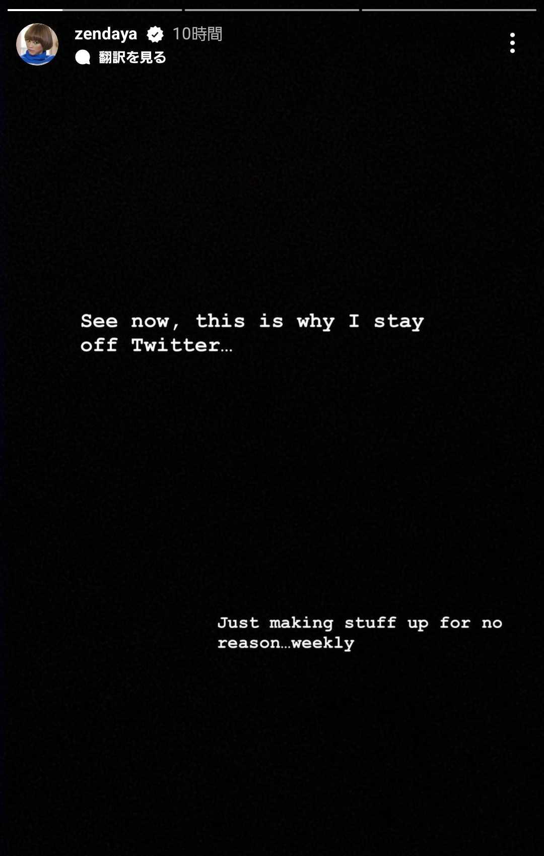 普段であれば根も葉もないウワサはスルーするゼンデイヤだが、今回は事が大きくなりすぎたと感じたのか、珍しくインスタグラムで反応。ゼンデイヤは「これがツイッターから離れている理由」「毎週、意味もないウワサ話を捏造している」とうんざりした様子だった。