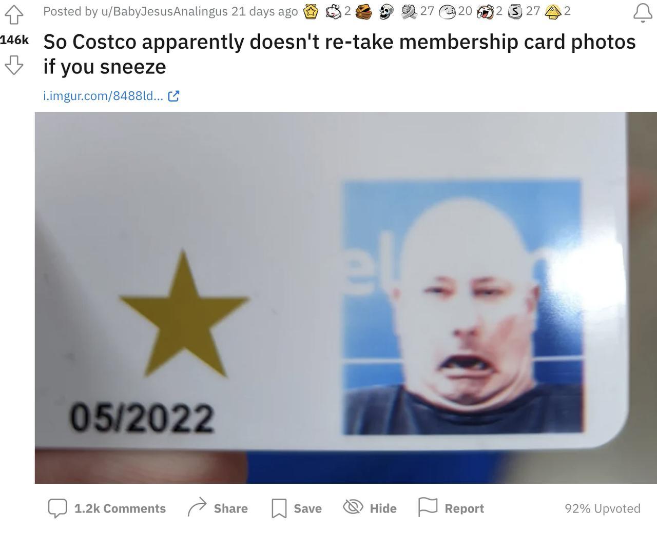 アメリカ在住のコストコ会員の男性も証明写真の撮影で“やっちまった”ひとり。男性が、「コストコはくしゃみをしても会員証の写真を撮り直しさせてくれないらしい」という恨み節にも近いコメントを添えて、米掲示板Redditに投稿した写真がこちら。