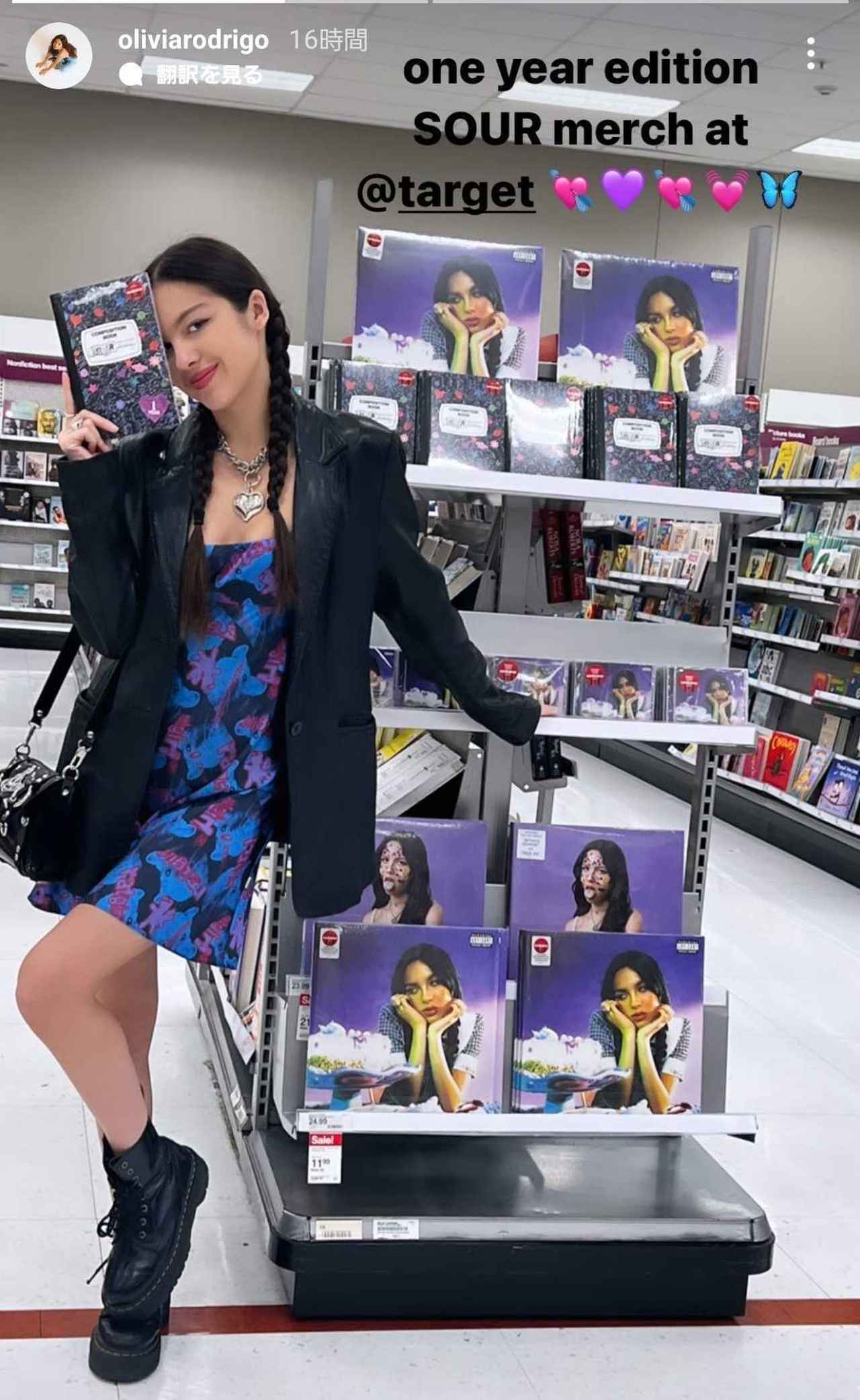 大型スーパーであるターゲットで、自分のアイテムが発売されているのを喜んでいるオリヴィア・ロドリゴ。この日着用したワンピースは、オリヴィアが大ファンだという、2020年に誕 生したマーク・ジェイコブス(Marc Jacobs)の新ラインであるヘブン・バイ・マーク・ ジェイコブス(Heaven By Marc Jacobs)のもので、コミカルなプリントがポップな1 枚。