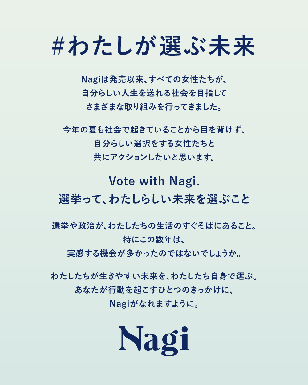 Nagiが「Vote with Nagi 2022」を発足させたのは、すべての女性が自分らしい人生を送れる社会になってほしいという思いから。日本には深刻なジェンダーギャップがあることや、あらゆる選択の多様性が担保されていないといった問題から目を背けず、自分らしい選択をする女性たちと共にアクションを起こすべく、「Vote with Nagi 2022」を開始することが決まったそう。