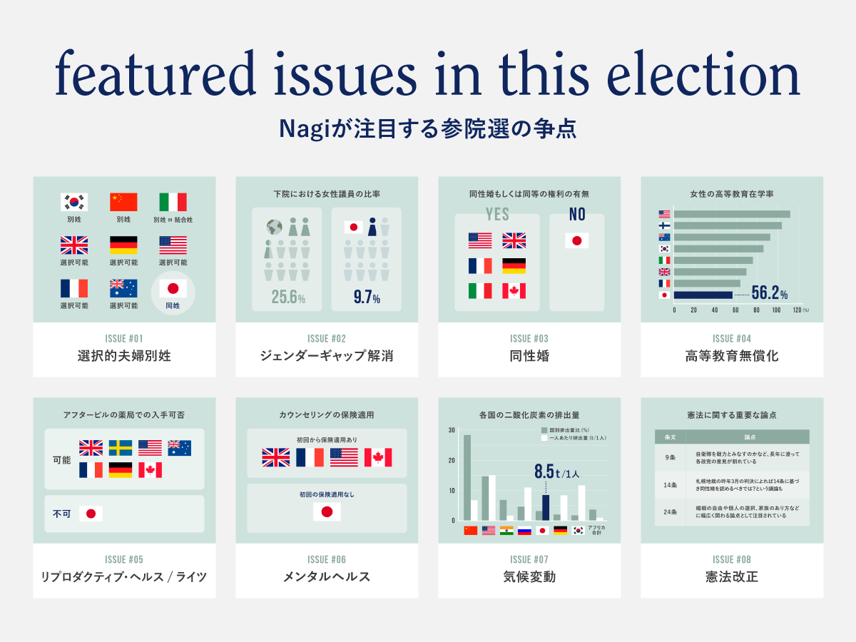 さらにNagiは、参議院議員選挙で注目する争点をユーザーからの声をもとにまとめる取り組みも行なっている。気になる争点についてSNSで発信をすることもオススメしていて、投稿の際は「#わたしが選ぶ未来」をつけて投稿するよう呼び掛けている。
