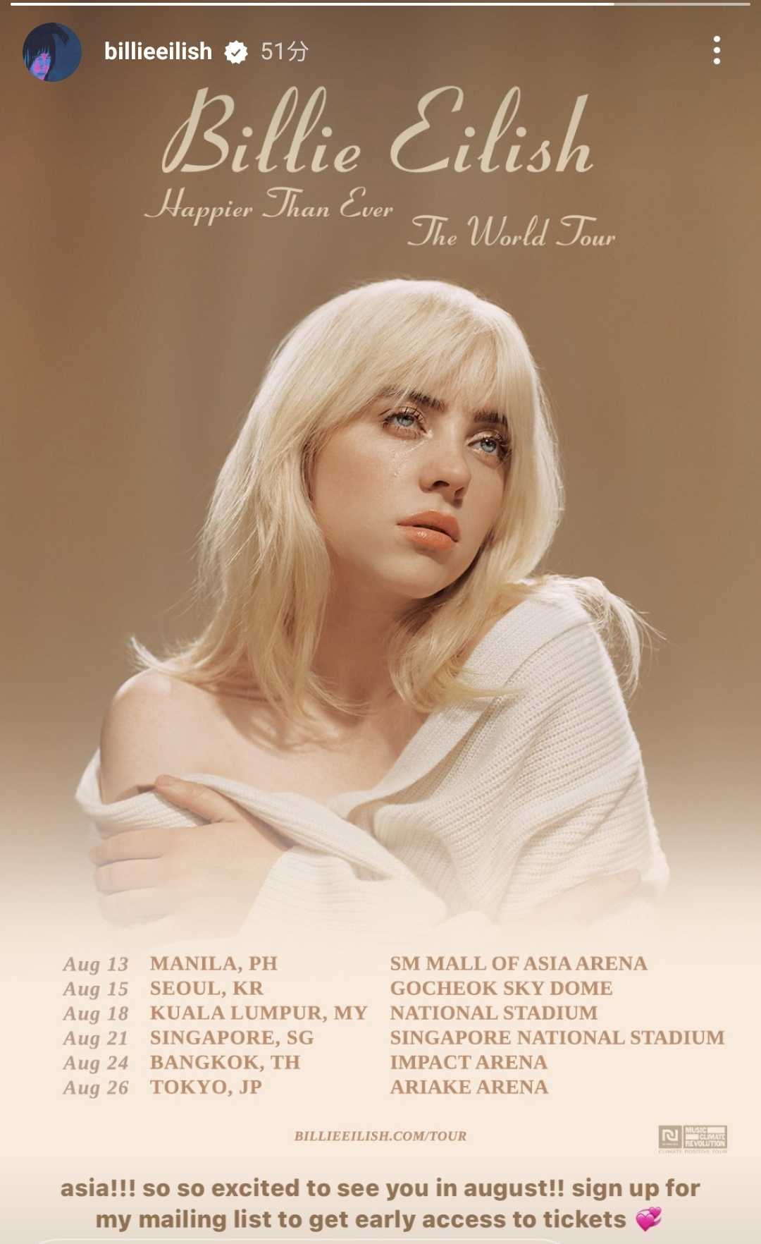 今回のツアーも7月までの欧米での公演と9月からのオーストラリアとニュージーランドの公演しか日程が発表されていなかったが、この度ビリーが日本を含むアジアツアーのスケジュールをインスタグラムで発表した。