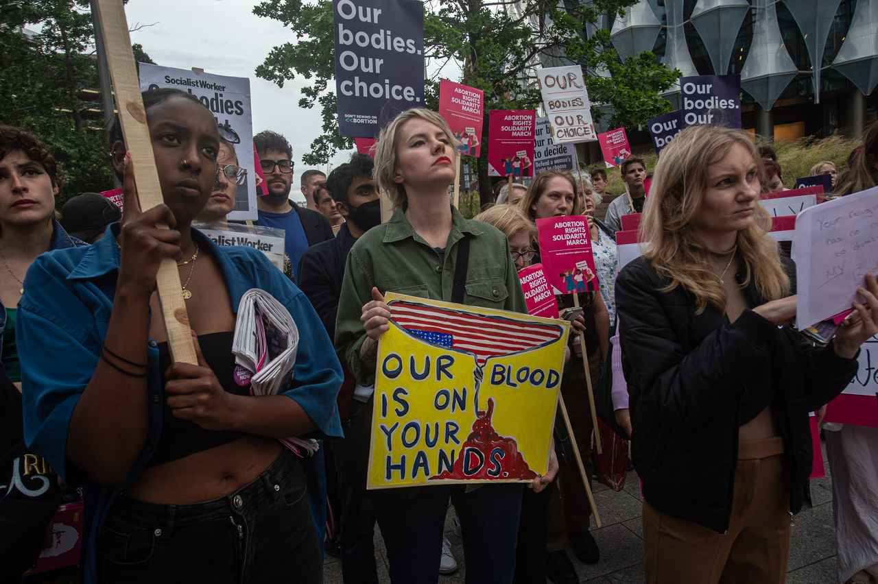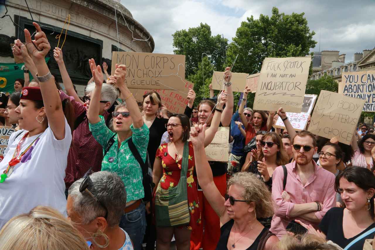 「ロー対ウェイド」の判決が覆されたことで、世界各国でデモが起こっている。フランスで2022年6月26日に撮影。