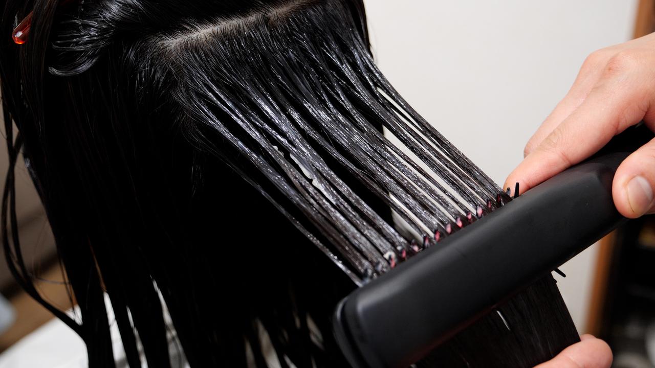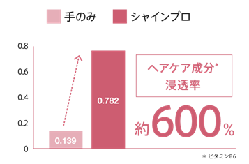 ※ビタミンB6水溶液に浸した毛束に超音波アイロン(本製品と同等の仕様)を1分間照射したものと、同様の毛束を手で1分間なでつけたものについて、コルテックス中のビタミンB6を測定した。超音波を1分間照射したものの方がビタミンB6が約6倍多く存在した。