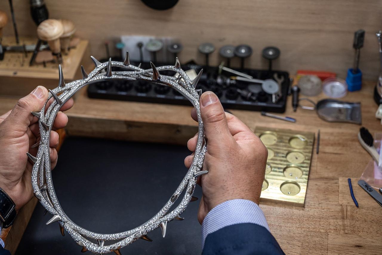 そしてティファニーの4人の職人がこのいばらの冠の制作に費やした時間は、なんと10ヵ月。約1,300時間を超える作業時間を経て、ケンドリックのいばらの冠を完成させた。