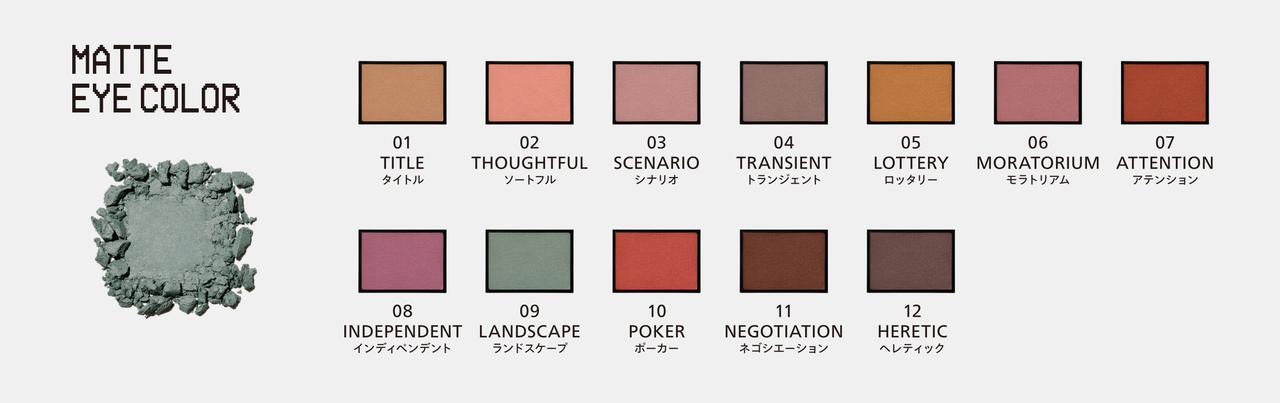 「エムエヌ マイアイカラー マット(全12色)」は、パール無配合で混じり気のないトゥルーマットのアイカラー。厚塗り感がなく、まぶたを染めるように自然に発色。植物由来の美容オイル配合※1&メルティスムース処方で、驚くほどになめらかなつけ心地で、重ねてもよれにくく、美しい仕上がりを長時間キープする。