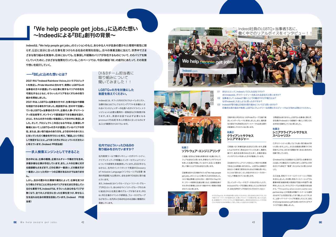 Indeed Japanは『BE』の発刊について、「Indeedは、「We help people get jobs.」をミッションとし、LGBTQ+の方々を含むすべての人々が自分らしく働け、幸せにつながるような仕事が見つかる社会を実現していきたいと考え、さまざまな取り組みを行なっています。本誌が、あらゆる人々が公平に、自分に合った仕事が見つけられ、幸せに働ける社会を実現していくための一助となることを願っています」とコメントしている。