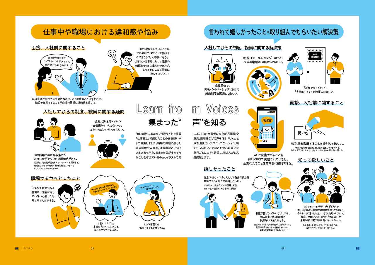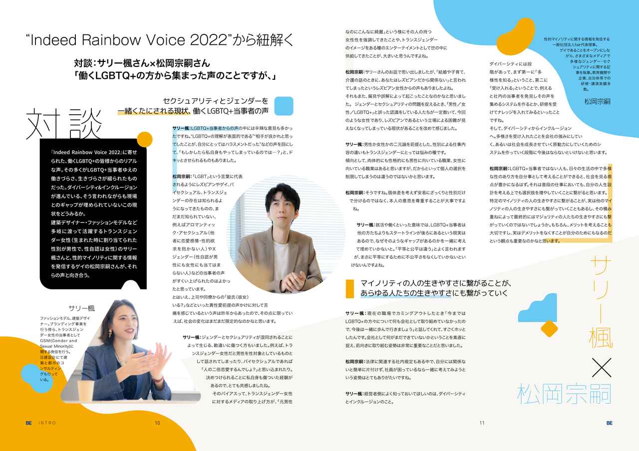 まず本誌の素晴らしいところは、当事者の「声」や企業での「実例」というしっかりとしたデータをもとにしているところ。雑誌には職や職探しに関する当事者の困りごとや意見が紹介されており、それをもと、さまざまな分野で働く当事者や、企業の取り組みの実例を紹介しながら、どのような課題があり、どのようにすればそれを解決できるかといったアイディアを提案している。『BE』を制作・発行している日本法人Indeed Japan株式会社は、「本誌を手に取って読んでいただくことで、LGBTQ+の方々が直面している職場でのバリアに多くの人が気づくきっかけとなり、バリアの削減・解消が進むことを願っています」と語った。
