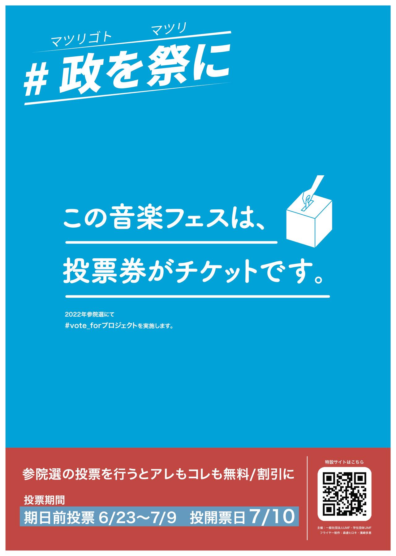 一般社団法人UMFが実施する「#vote_forプロジェクト」では、日本全国の200を超える提携店舗で特別な無料/割引クーポンが発行。参院選にて投票を行なうと全国のJOYSOUND直営店で6月23日~8月31日まで何度でもカラオケが30%オフになったり、6月23日7月31日まで何度でも店内商品や公式通販10%オフになったりと、さまざまな特典が受けられる。さらに、投開票日には大阪・服部緑地野外音楽堂にてアーティストや芸人らが出演する音楽フェスティバル『マツリゴト JAPAN 2022』を開催。こちらも第26回参議院議員選挙で投票した方は無料で入場できる。