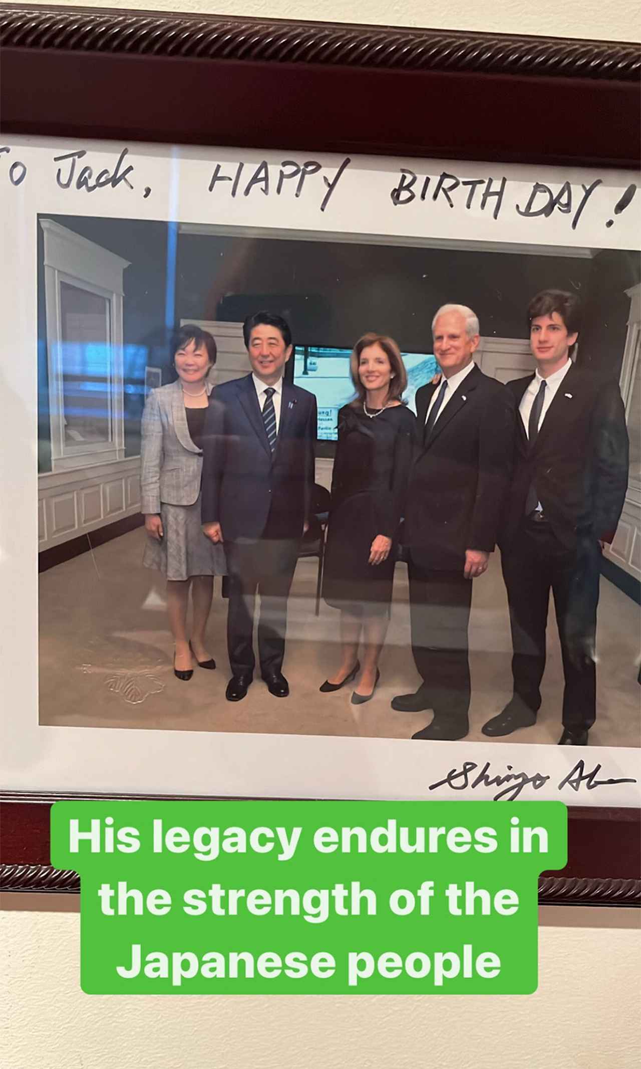 さらに、「彼の遺志は日本人の強さの中に息づいています」という言葉とともに投稿した画像には、安倍元首相と安倍昭恵夫人、そして自身の両親と一緒に撮った記念写真が写っていた。写真は額に入れて飾られており、余白には、英語で書かれた「To Jack, Happy Birthday!(ジャックへ、誕生日おめでとう)」という直筆のメッセージと、「Shinzo Abe(安倍晋三)」というサインが記されていた。