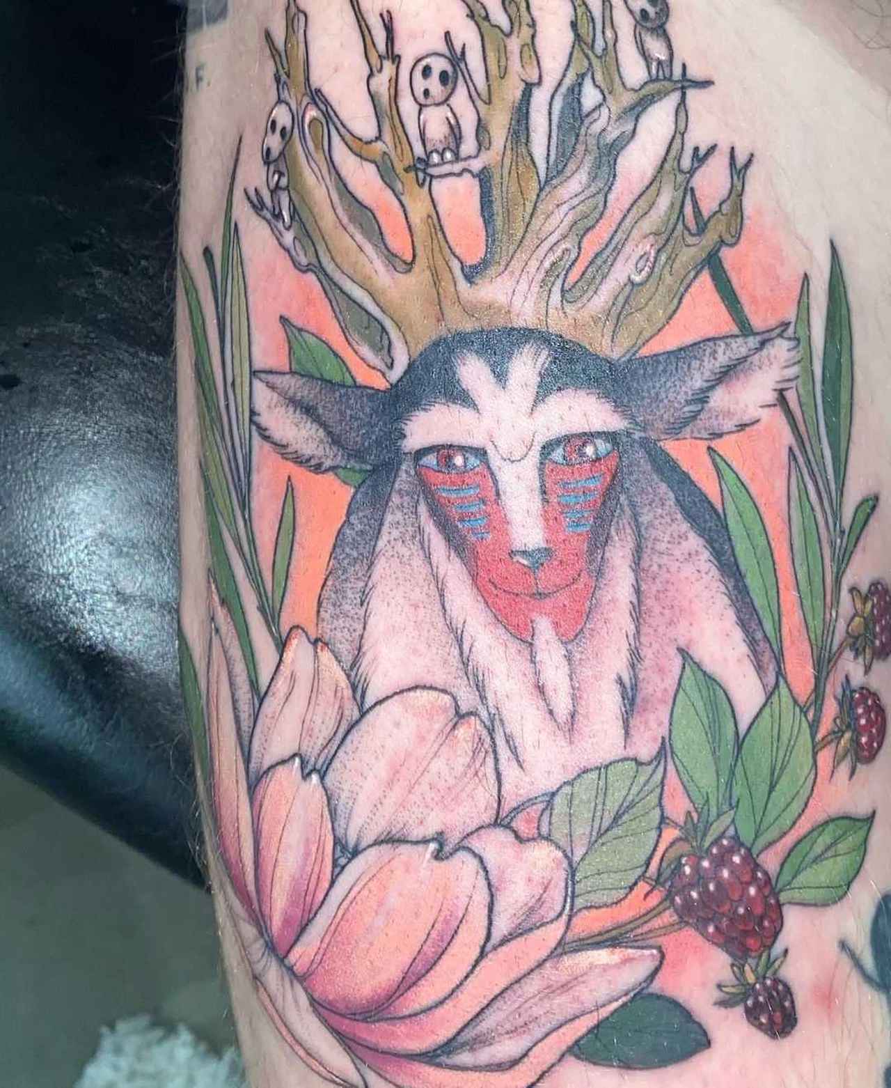 なんとマシン・ガン・ケリーがリハーサル中に入れたタトゥーは、日本を代表するジブリ映画『もののけ姫』に登場するシシ神。その周りにはコダマもデザインされており、マシン・ガン・ケリーの太ももには『もののけ姫』の世界が広がっていた。