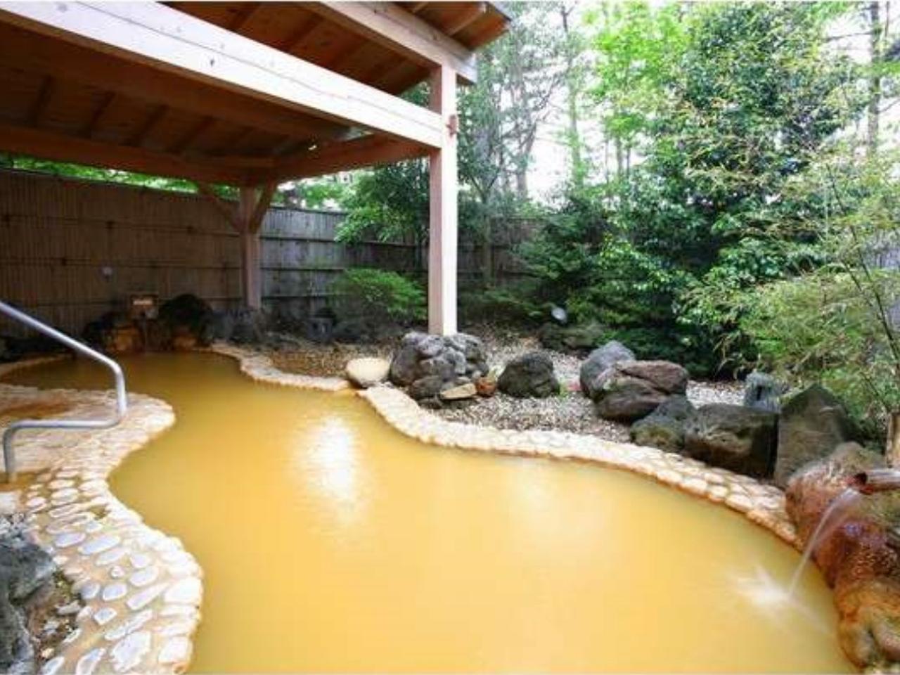 源泉かけ流しの天然温泉。濁った淡黄色で肌がすべすべに。