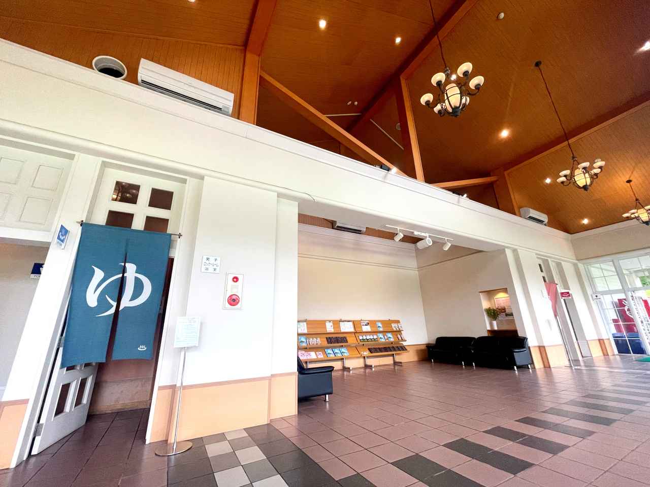 フロントがある建物の中には、グランピング施設には珍しい源泉かけ流しの天然温泉も併設。大浴場は、内風呂と露天風呂の2ヵ所あり、露天風呂は天然温泉のかけ流し。お湯は濁った淡黄色。