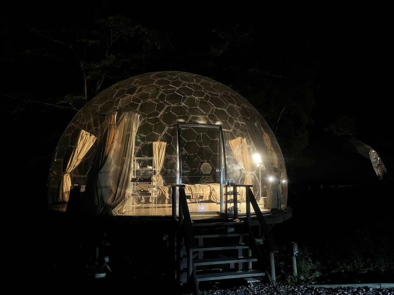 昼間とは違った装いの透明ドーム型テント「アウラ(AURA)」。